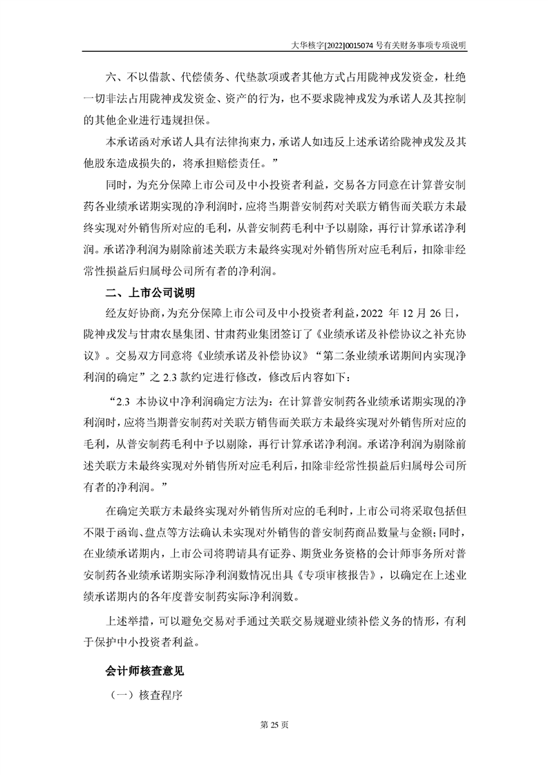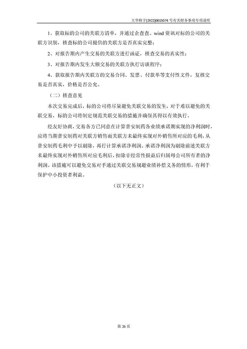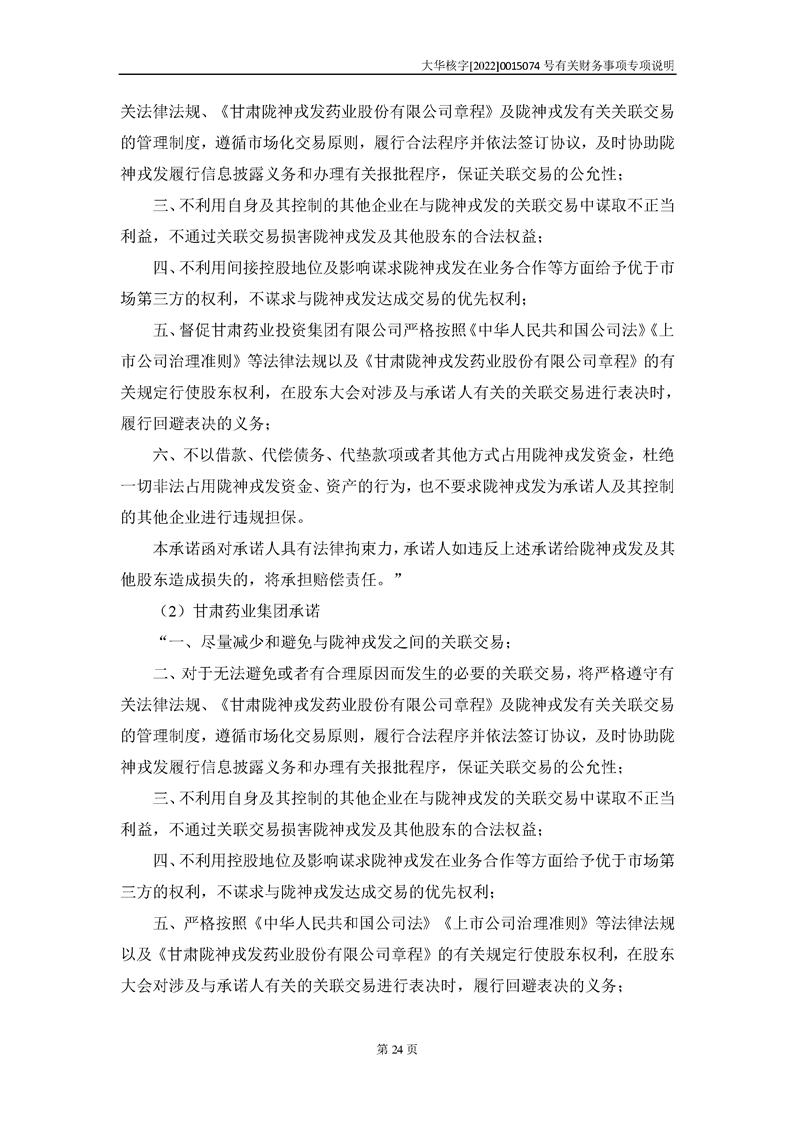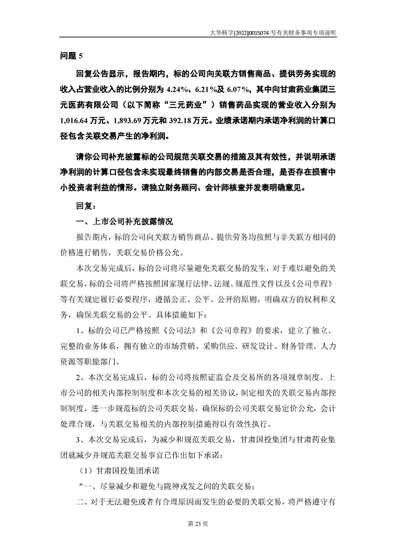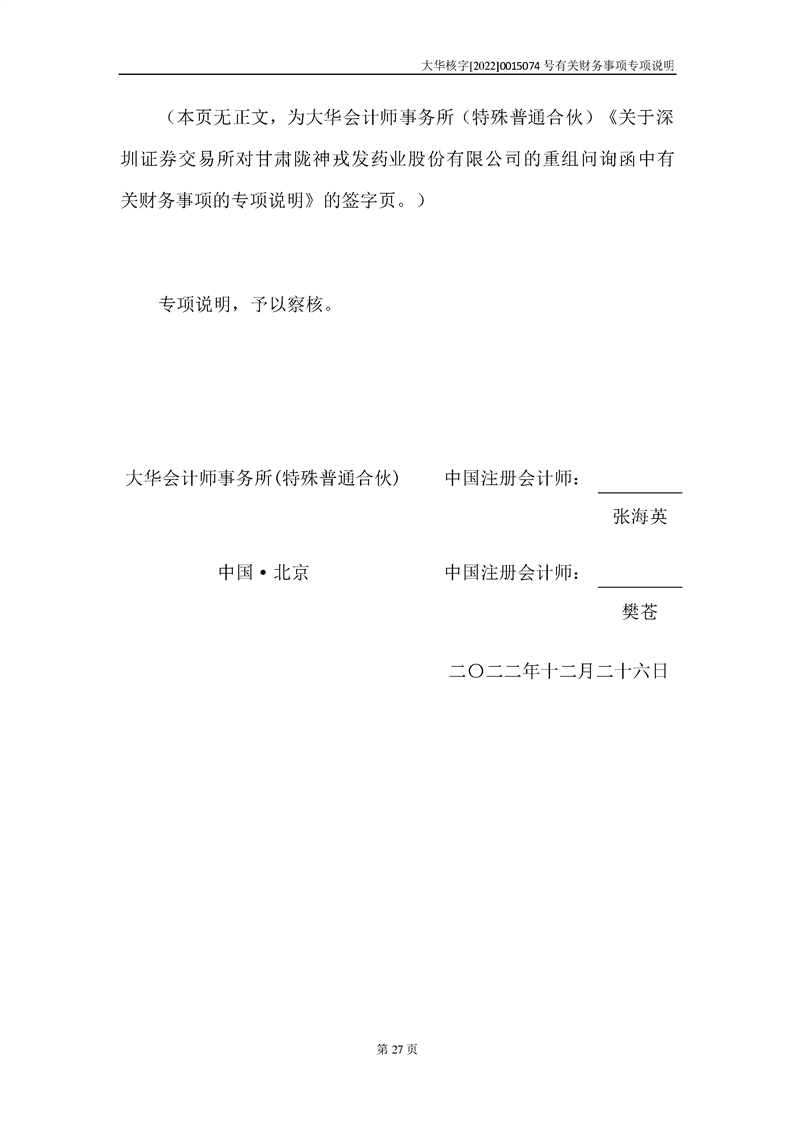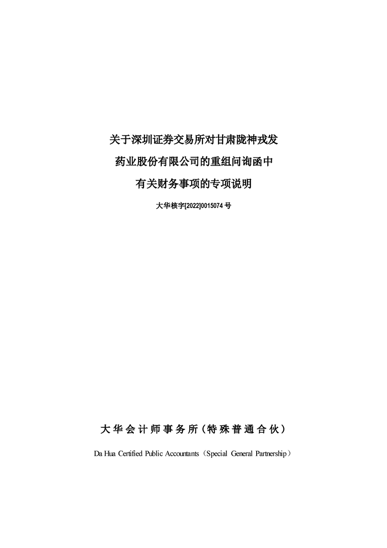 關(guān)于深圳證券交易所對(duì)甘肅隴神戎發(fā)藥業(yè)股份有限公司的重組問詢函中有關(guān)財(cái)務(wù)事項(xiàng)的專項(xiàng)說明-大華核字[2022]0015074號(hào)