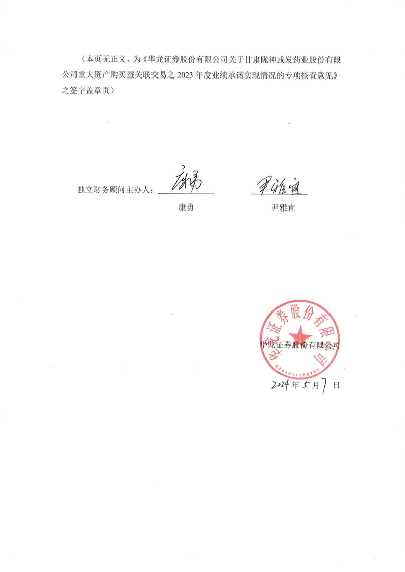 華龍證券股份有限公司關(guān)于甘肅隴神戎發(fā)藥業(yè)股份有限公司重大資產(chǎn)購(gòu)買暨關(guān)聯(lián)交易之2023年度業(yè)績(jī)承諾實(shí)現(xiàn)情況的專項(xiàng)核查意見(jiàn)(更正后)