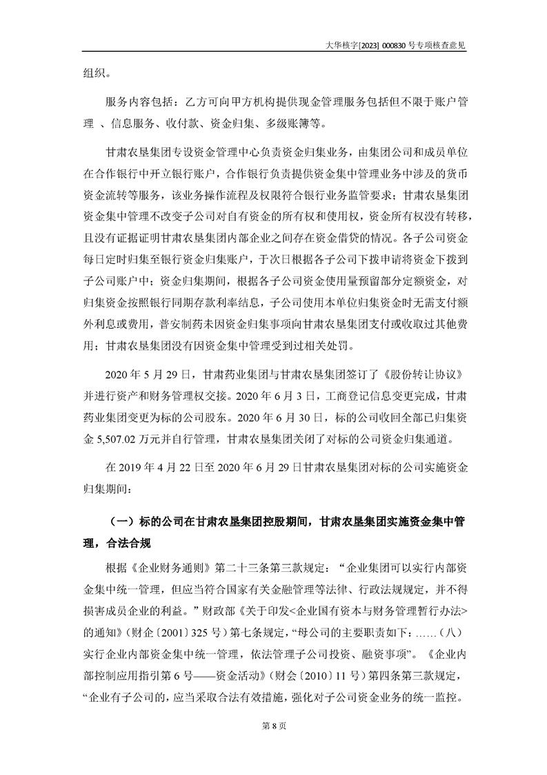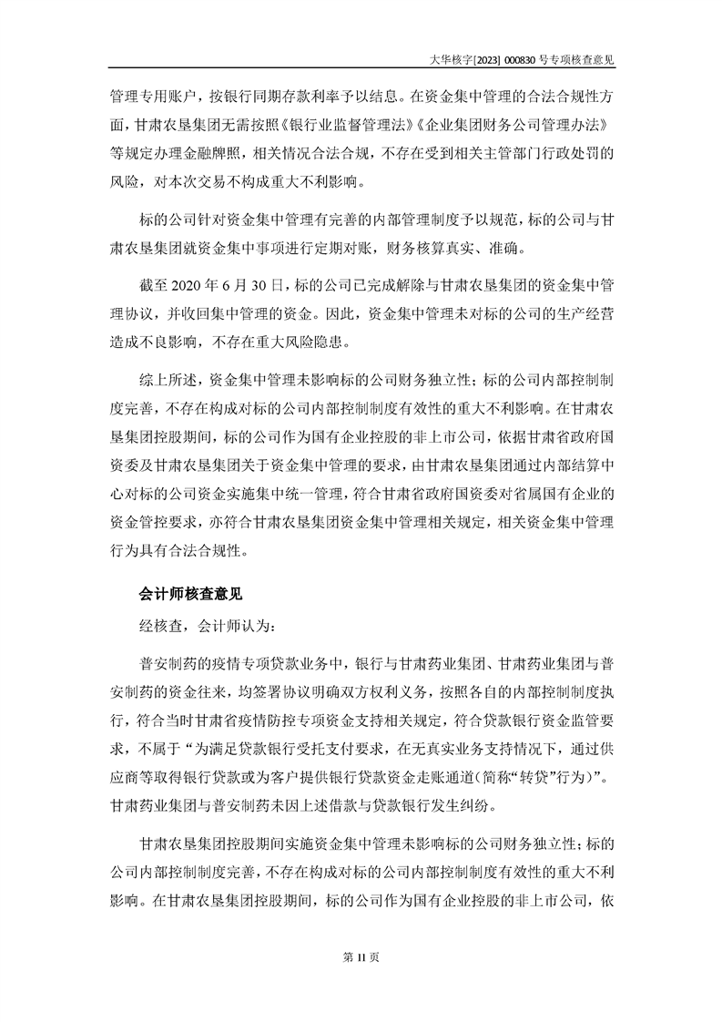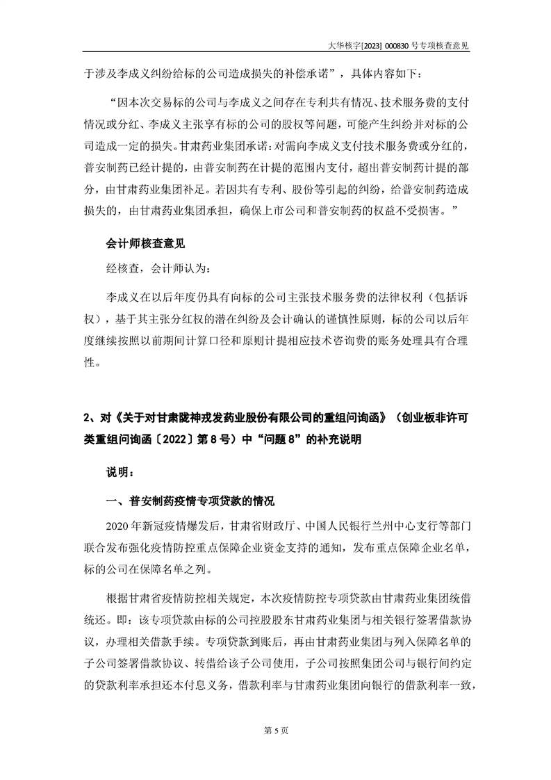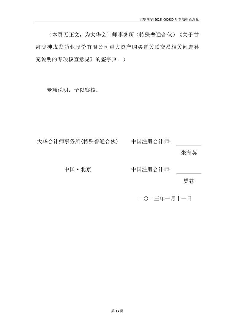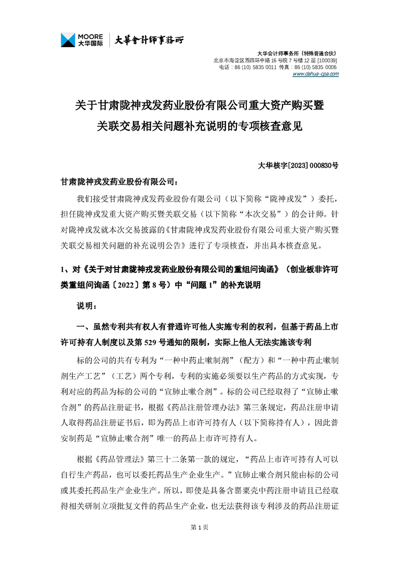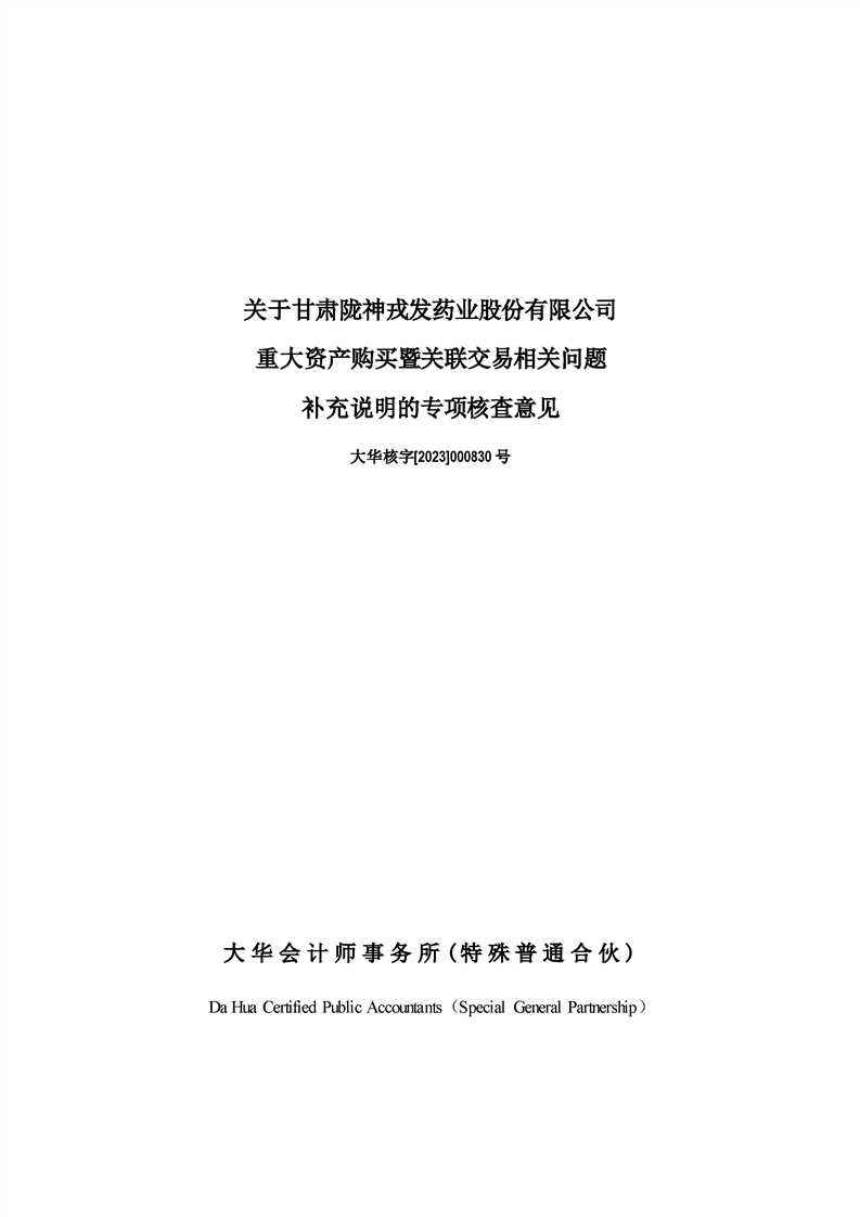 大華會(huì)計(jì)師事務(wù)所關(guān)于甘肅隴神戎發(fā)藥業(yè)股份有限公司重大資產(chǎn)購(gòu)買暨關(guān)聯(lián)交易相關(guān)問(wèn)題補(bǔ)充說(shuō)明的專項(xiàng)核查意見(jiàn)--大華核字[2023]000830號(hào)