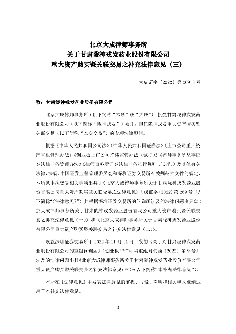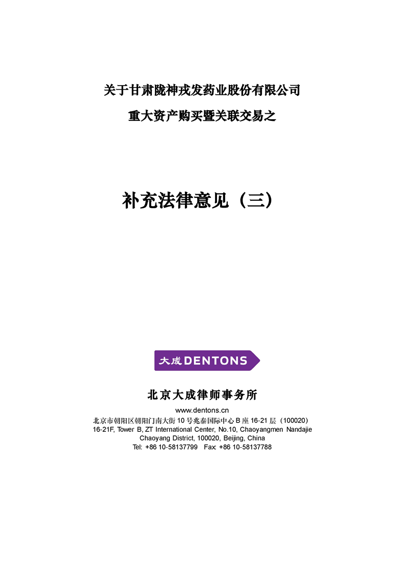 北京大成律師事務(wù)所關(guān)于甘肅隴神戎發(fā)藥業(yè)股份有限公司重大資產(chǎn)購買暨關(guān)聯(lián)交易補充法律意見(三)