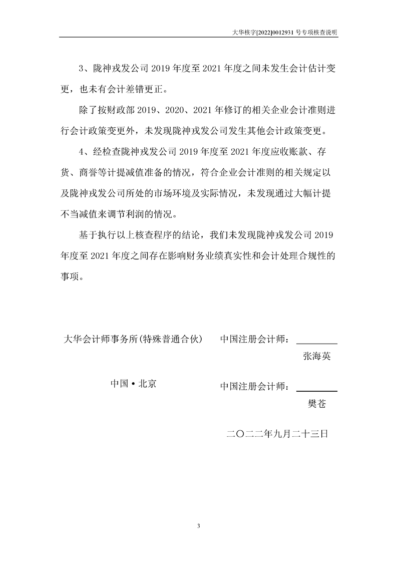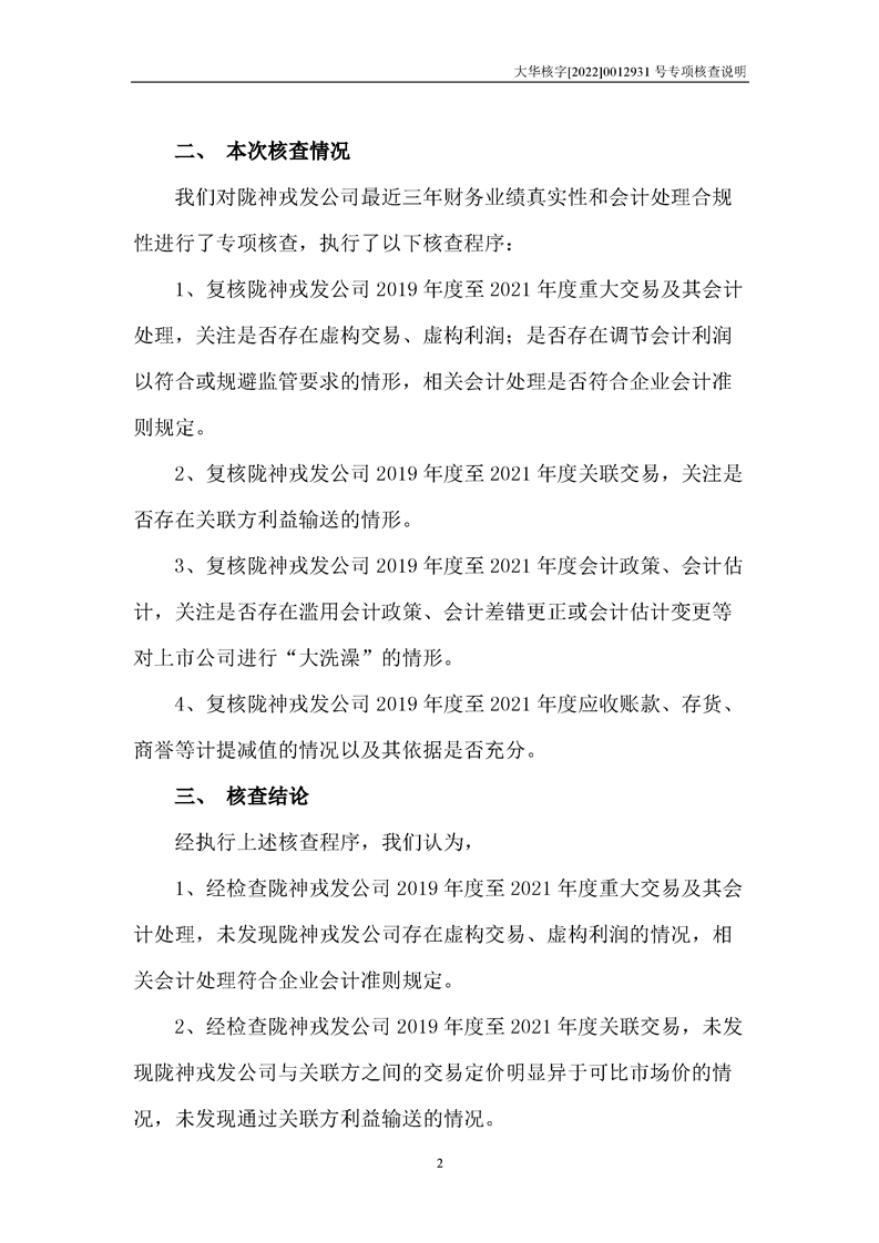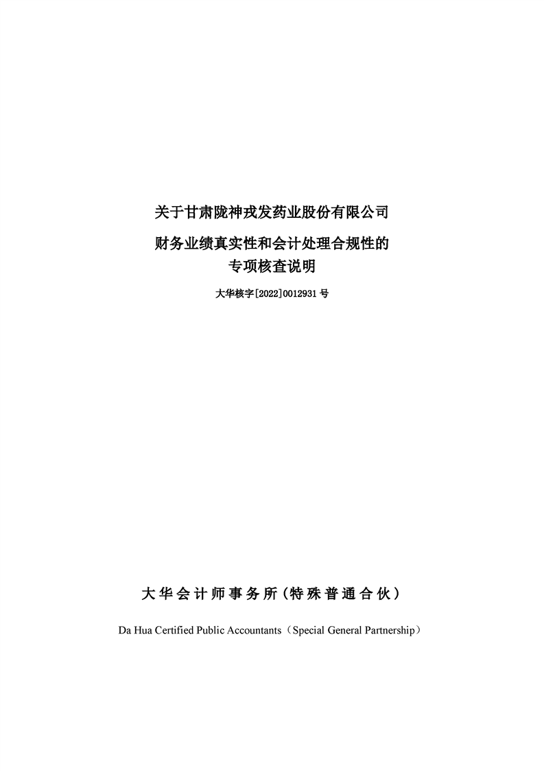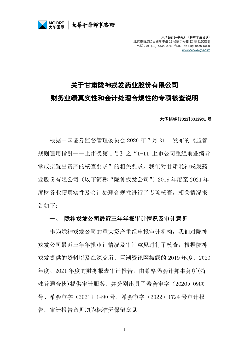 大華會計(jì)師事務(wù)所關(guān)于隴神戎發(fā)財(cái)務(wù)業(yè)績真實(shí)性和會計(jì)處理合規(guī)性的專項(xiàng)核查說明