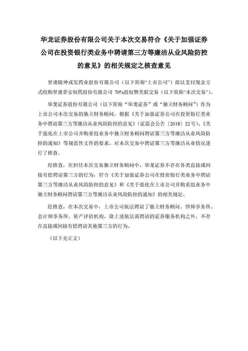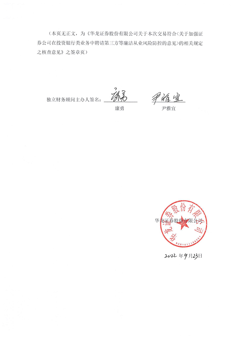 華龍證券股份有限公司關(guān)于本次交易符合《關(guān)于加強(qiáng)證券公司在投資銀行類業(yè)務(wù)中聘請第三方等廉潔從業(yè)風(fēng)險防控的意見》的相關(guān)規(guī)定之核查意見