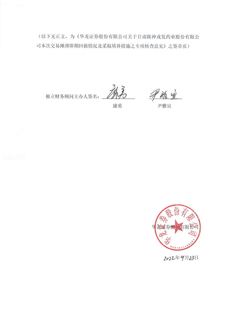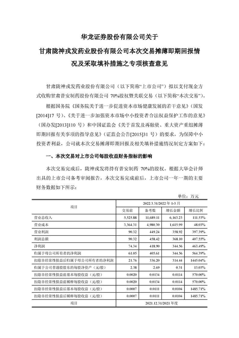 華龍證券股份有限公司關(guān)于甘肅隴神戎發(fā)藥業(yè)股份有限公司本次交易攤薄即期回報(bào)情況及采取填補(bǔ)措施之專項(xiàng)核查意見