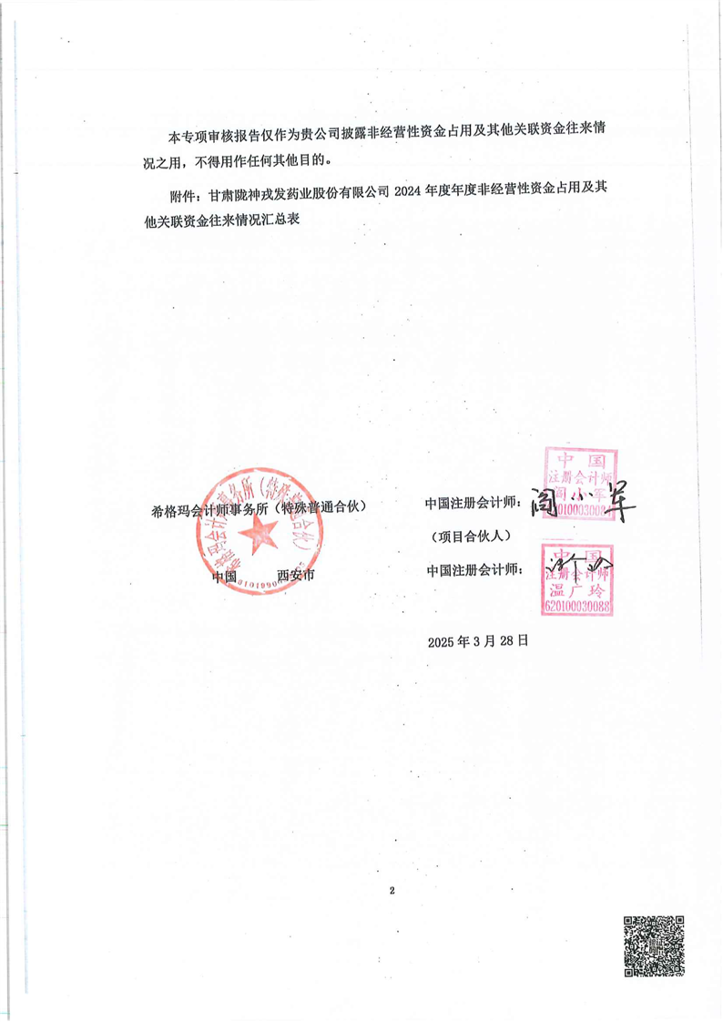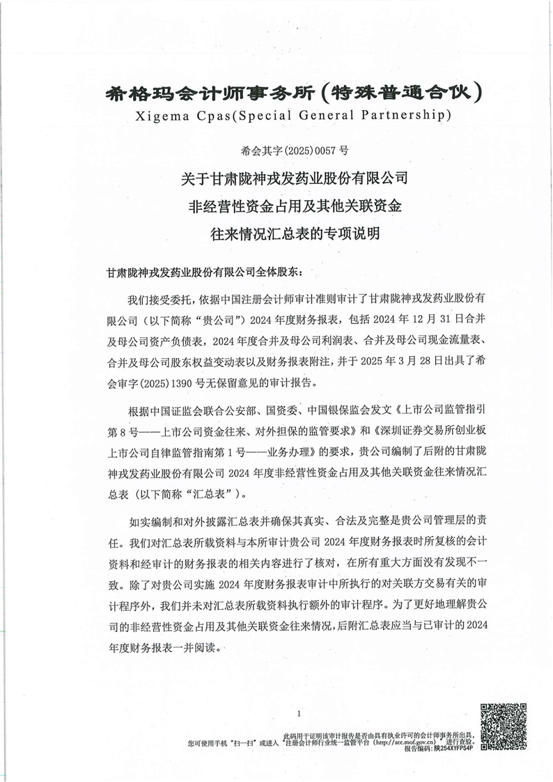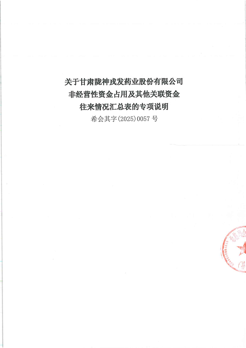關于甘肅隴神戎發(fā)藥業(yè)股份有限公司非經營性資金占用及其他關聯(lián)資金往來情況匯總表的專項說明