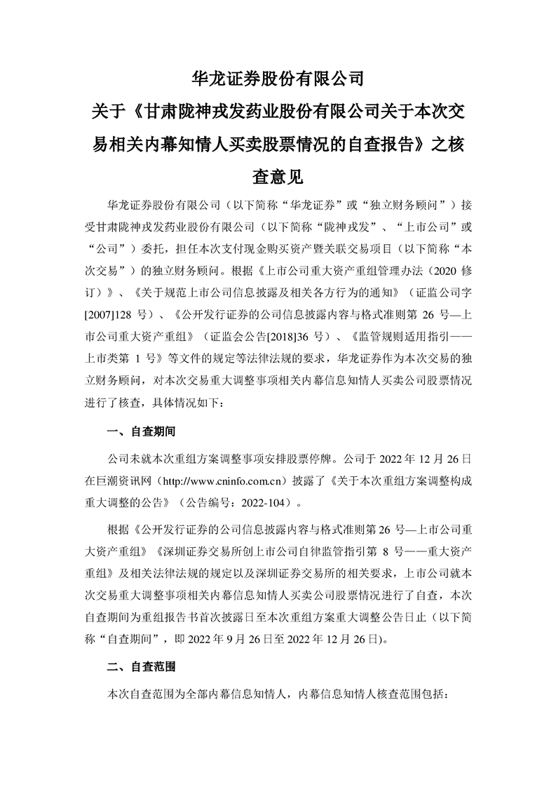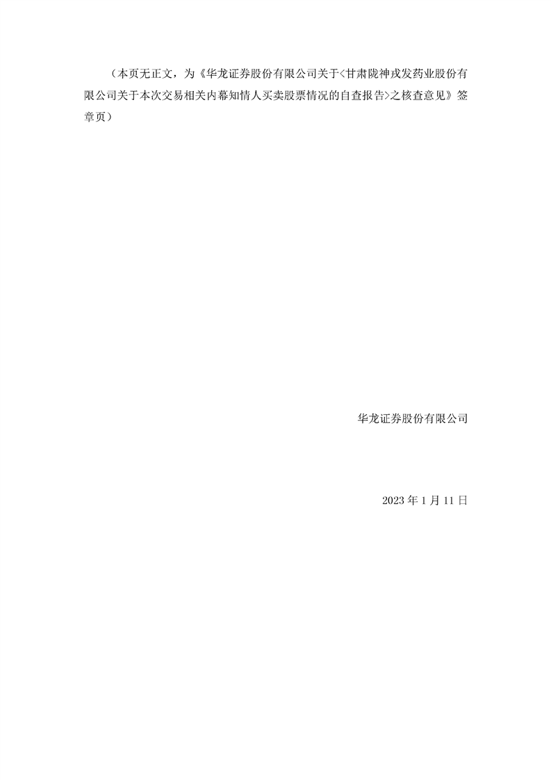 華龍證券股份有限公司關(guān)于《甘肅隴神戎發(fā)藥業(yè)股份有限公司關(guān)于本次交易相關(guān)內(nèi)幕知情人買賣股票情況的自查報(bào)告》之核查意見