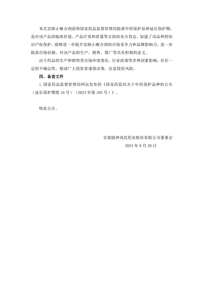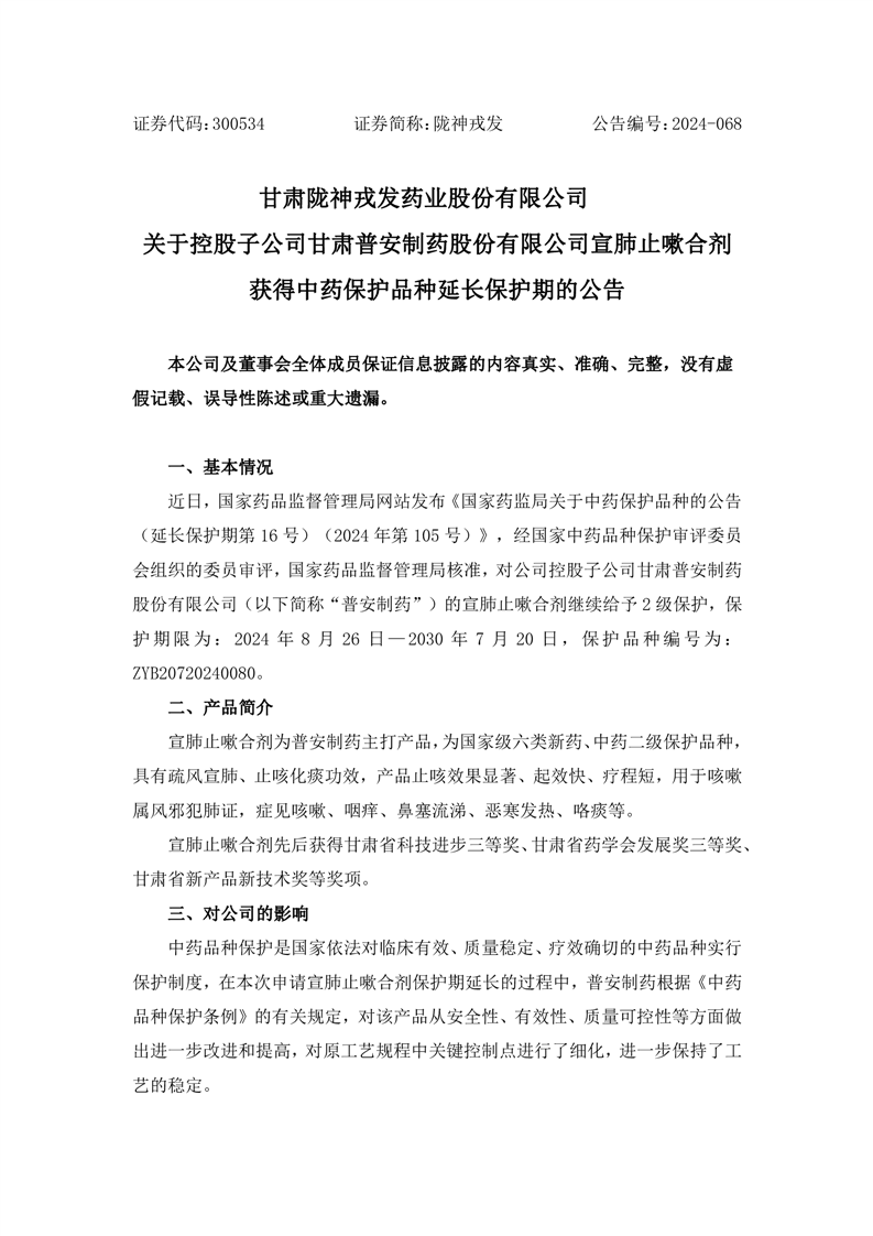 關(guān)于控股子公司甘肅普安制藥股份有限公司宣肺止嗽合劑獲得中藥保護(hù)品種延長保護(hù)期的公告