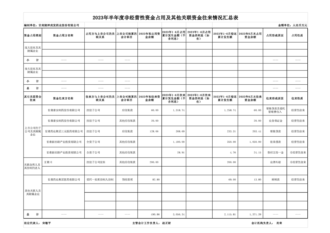 2023年半年度非經(jīng)營性資金占用及其他關(guān)聯(lián)資金往來情況匯總表