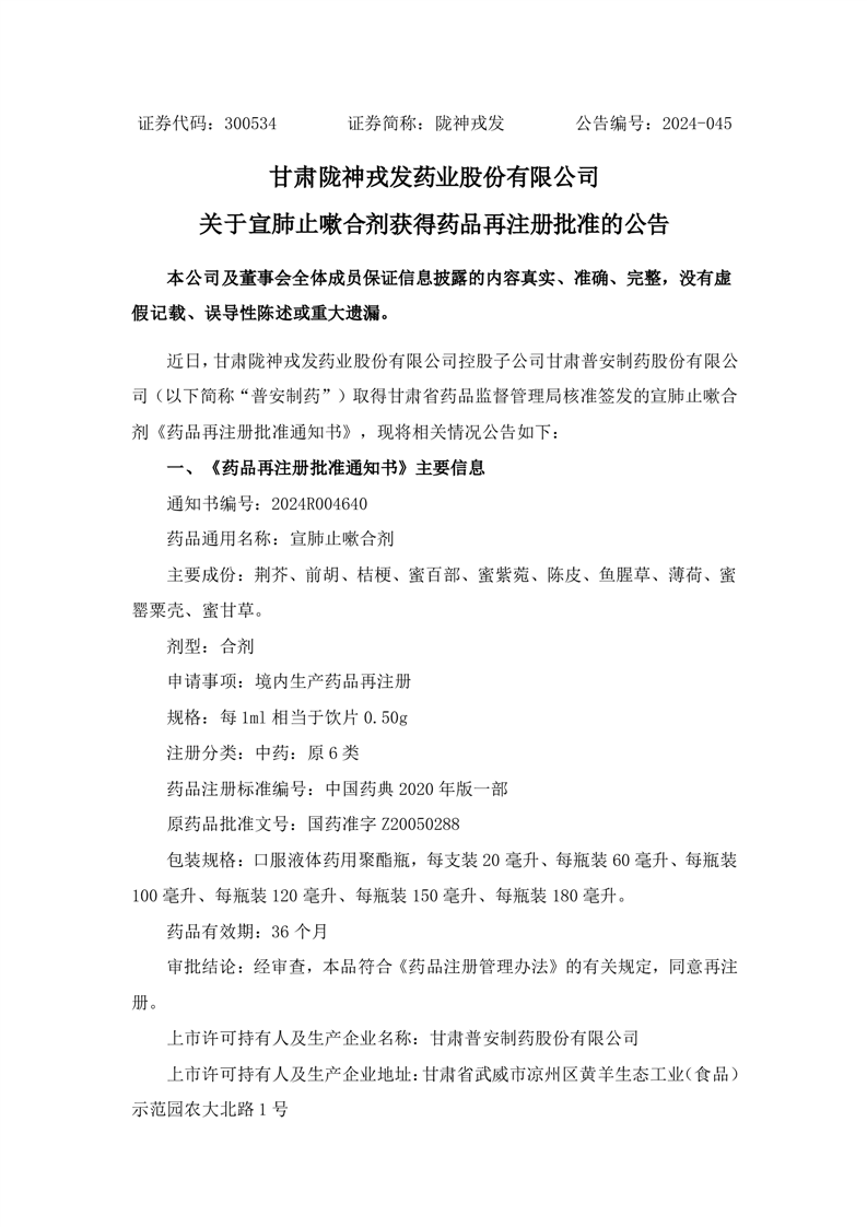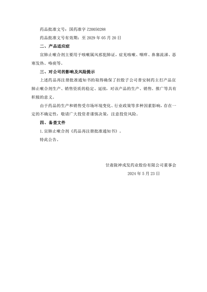 關(guān)于宣肺止嗽合劑獲得藥品再注冊批準(zhǔn)的公告