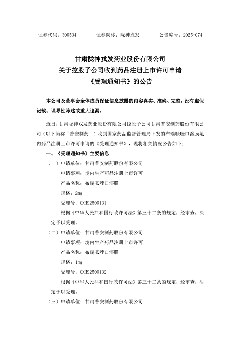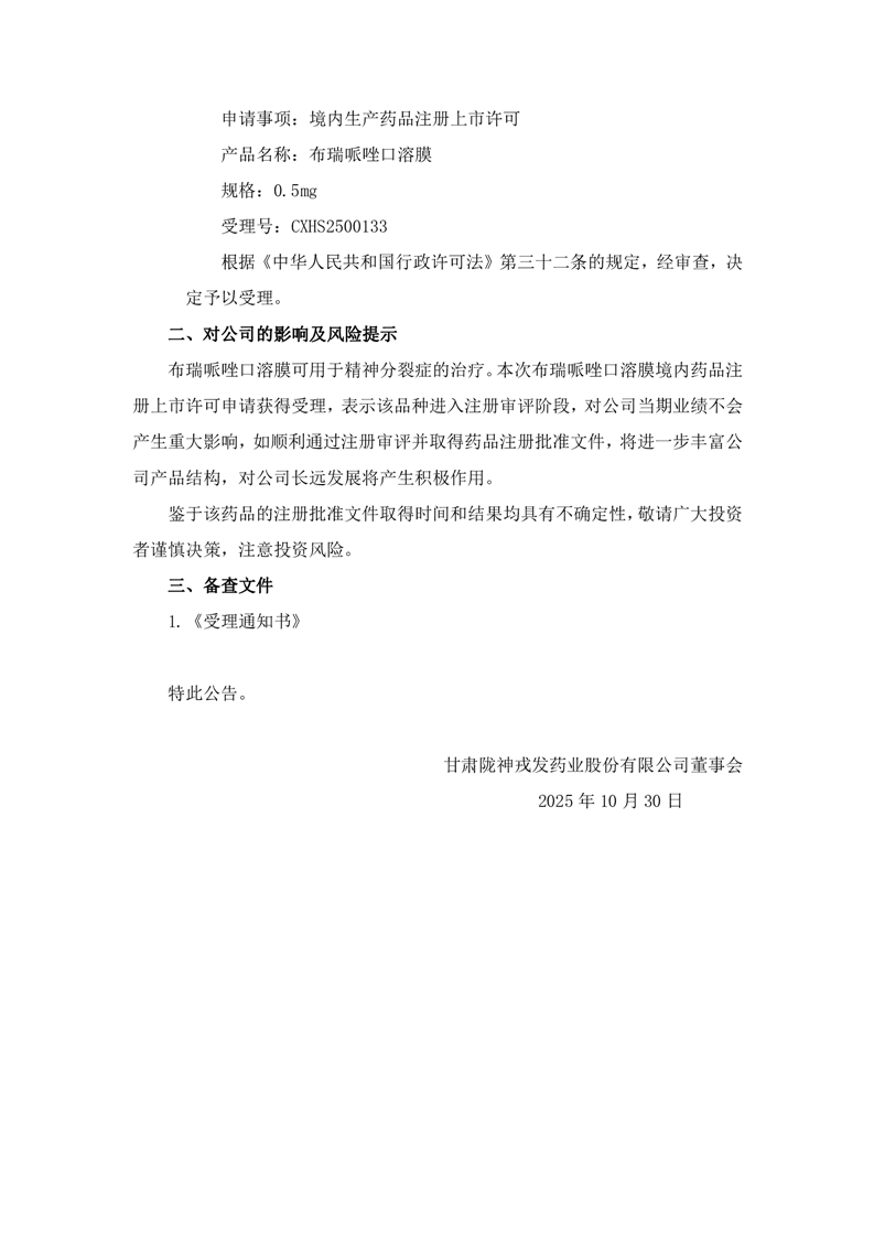 關(guān)于控股子公司收到藥品注冊上市許可申請《受理通知書》的公告