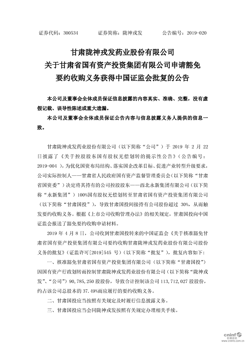 關(guān)于甘肅省國有資產(chǎn)投資集團(tuán)有限公司申請(qǐng)豁免要約收購義務(wù)獲得中國證監(jiān)會(huì)批復(fù)的公告