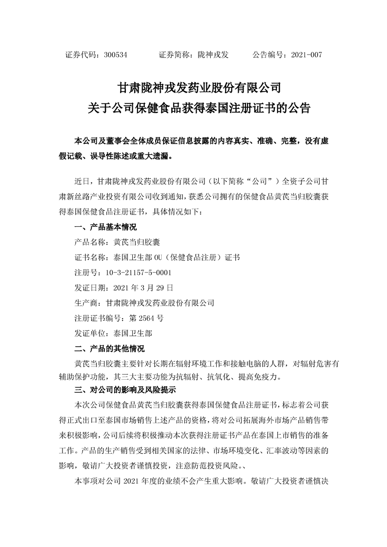 關(guān)于公司保健食品獲得泰國(guó)注冊(cè)證書(shū)的公告