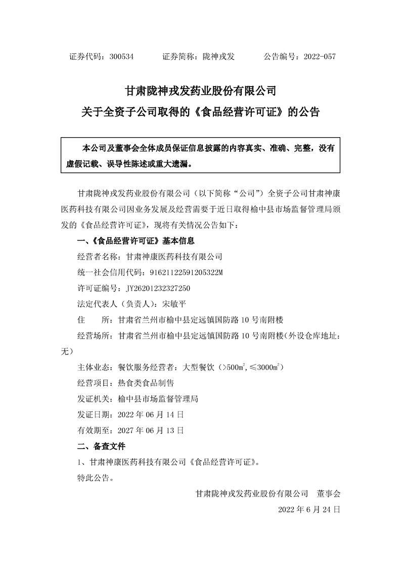 關(guān)于全資子公司取得《食品經(jīng)營許可證》的公告
