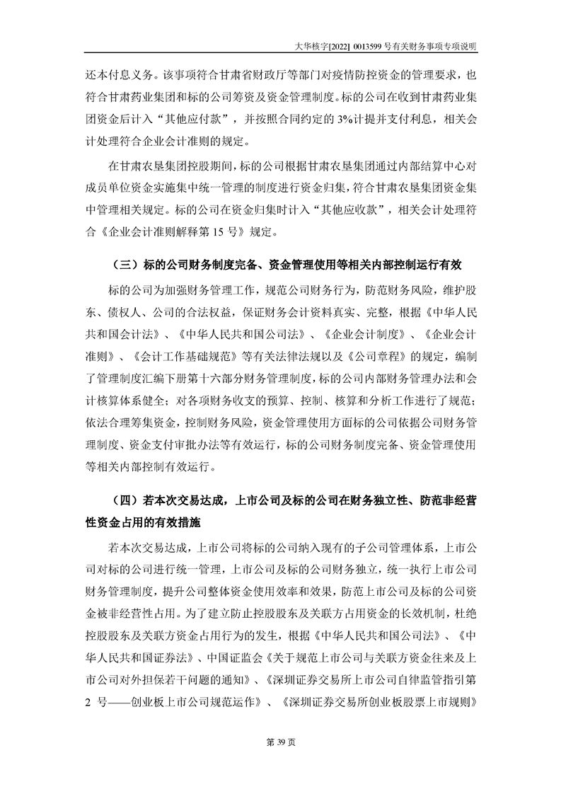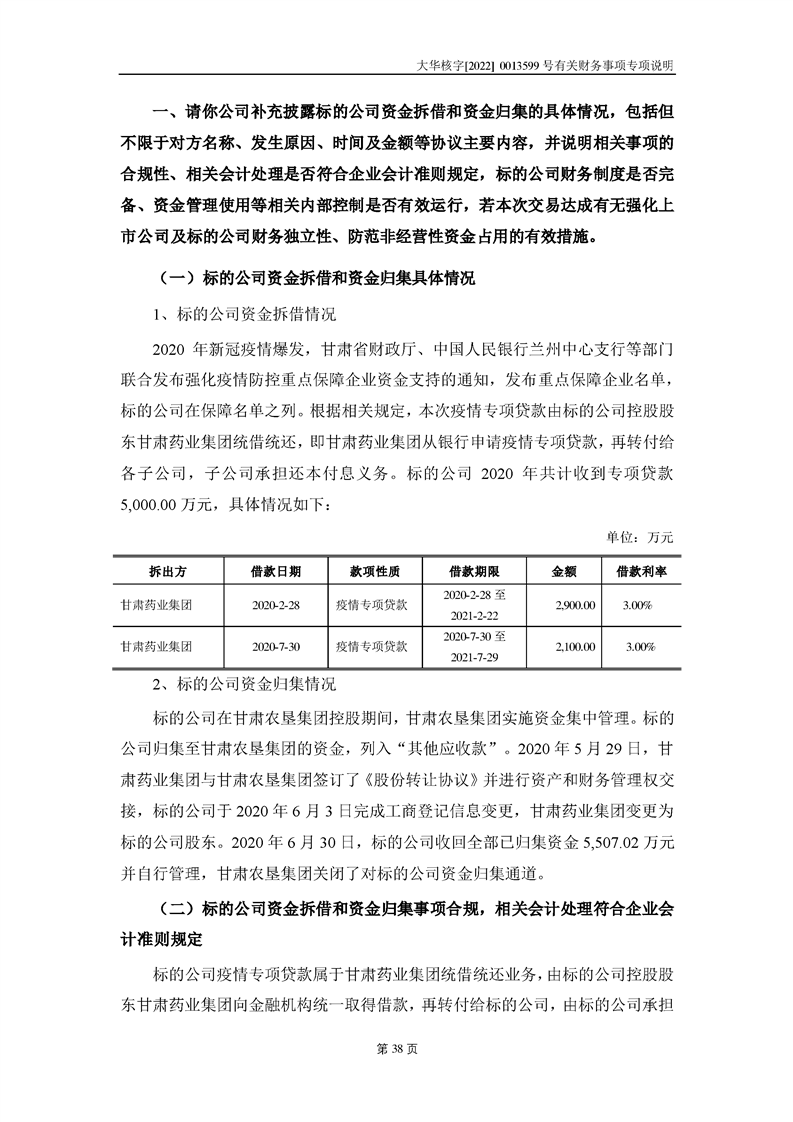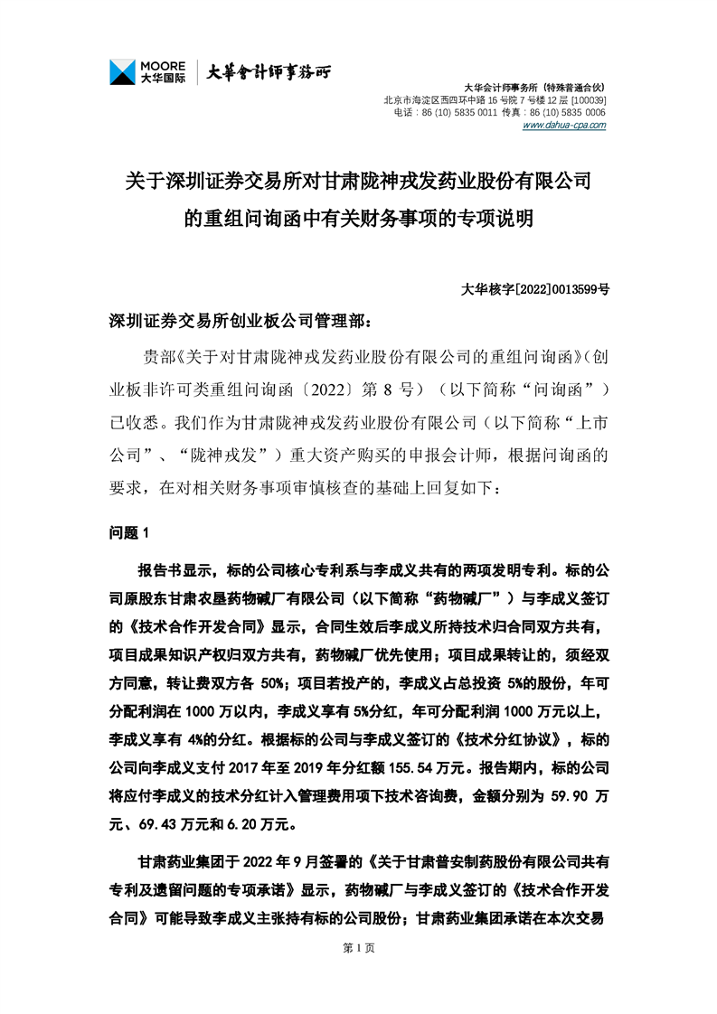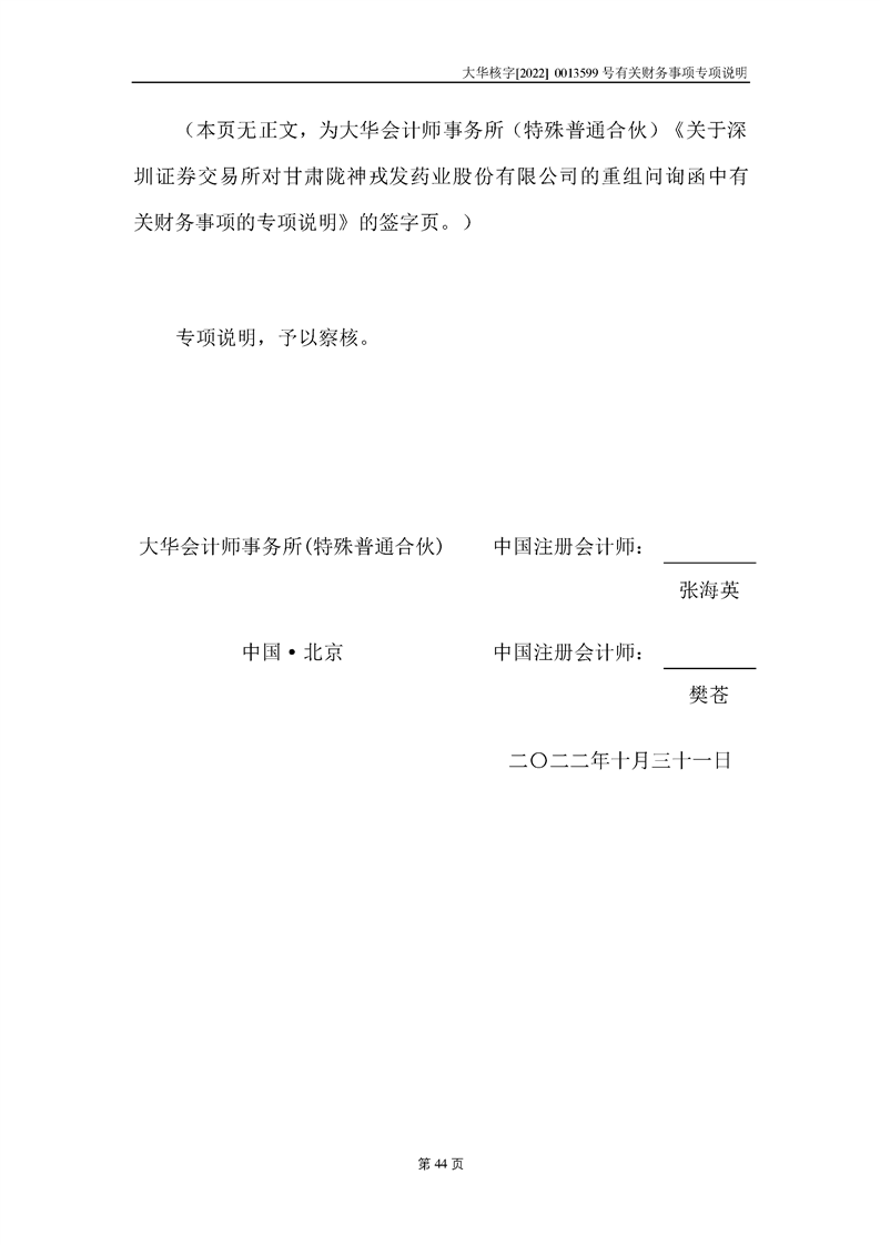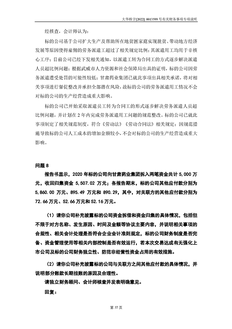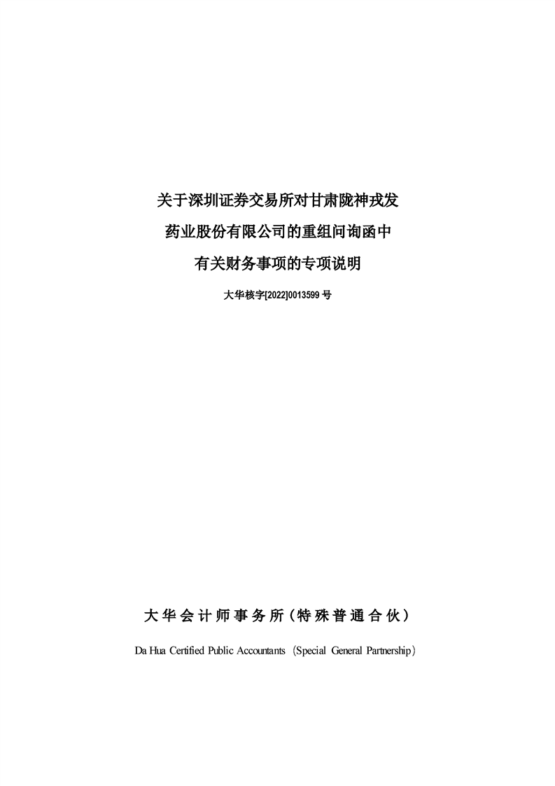 關(guān)于深圳證券交易所對甘肅隴神戎發(fā)藥業(yè)股份有限公司的重組問詢函中有關(guān)財(cái)務(wù)事項(xiàng)的專項(xiàng)說明大華核字[2022]0013599號(hào)