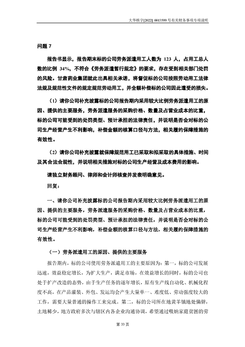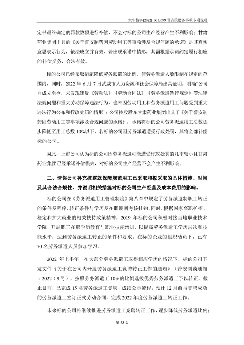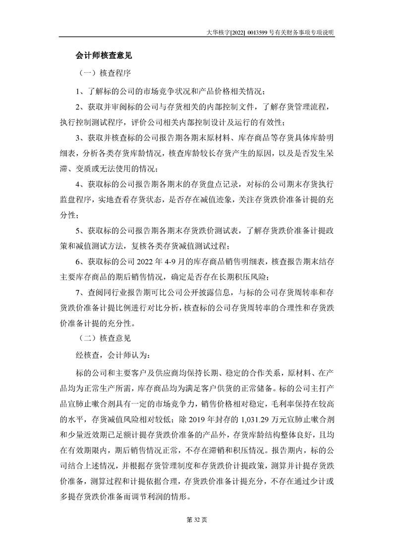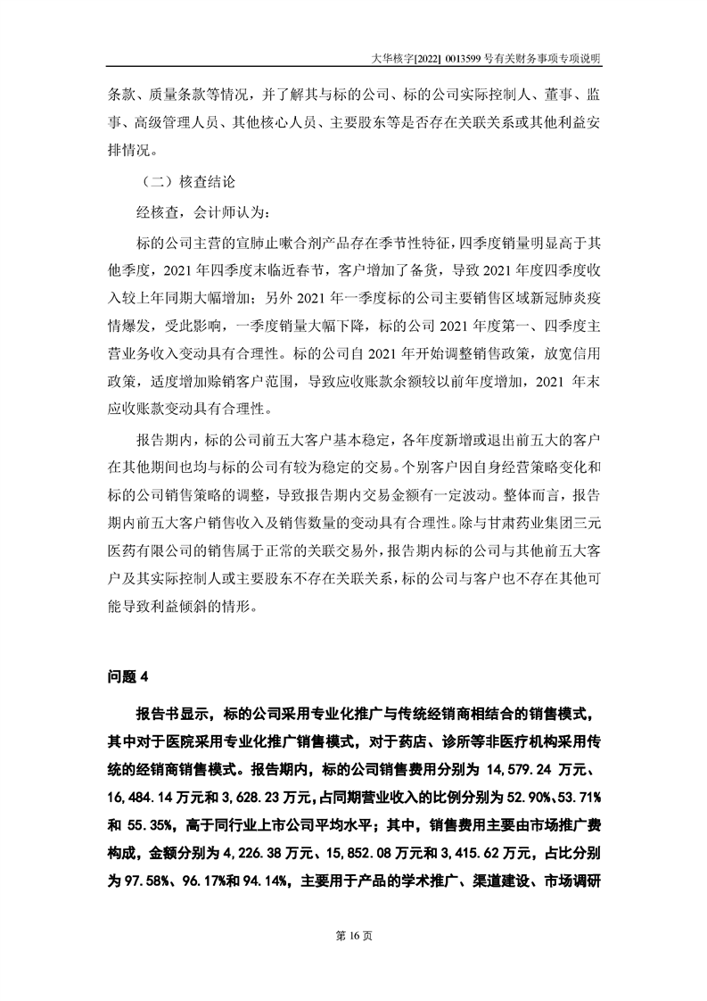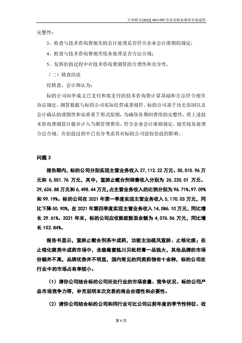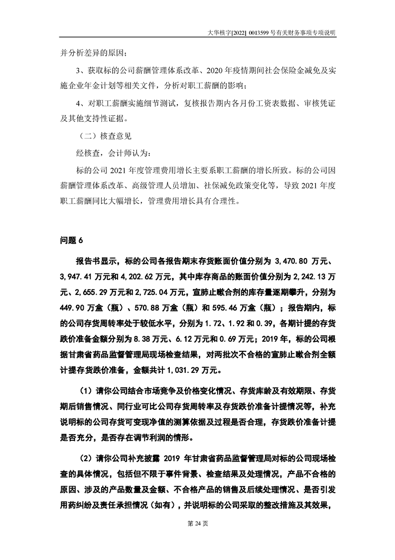 關(guān)于深圳證券交易所對甘肅隴神戎發(fā)藥業(yè)股份有限公司的重組問詢函中有關(guān)財(cái)務(wù)事項(xiàng)的專項(xiàng)說明大華核字[2022]0013599號(hào)