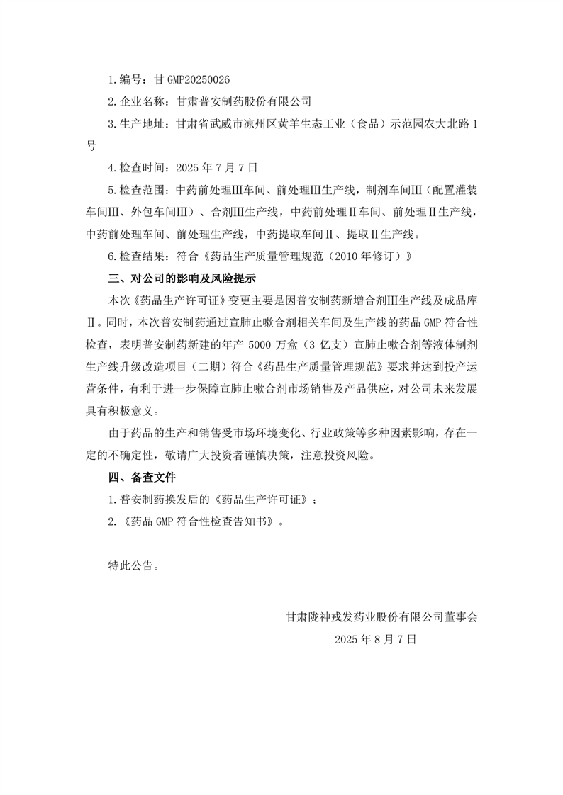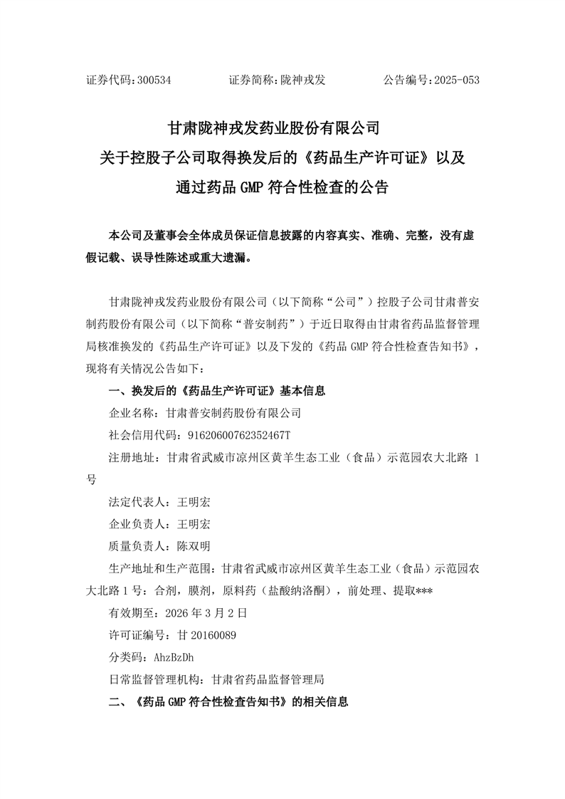 關(guān)于控股子公司取得換發(fā)后的《藥品生產(chǎn)許可證》以及通過(guò)藥品GMP符合性檢查的公告