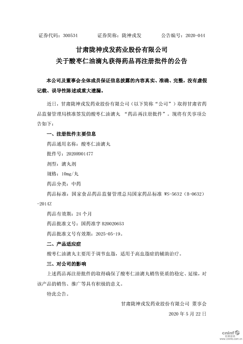 關于酸棗仁油滴丸獲得藥品再注冊批件的公告