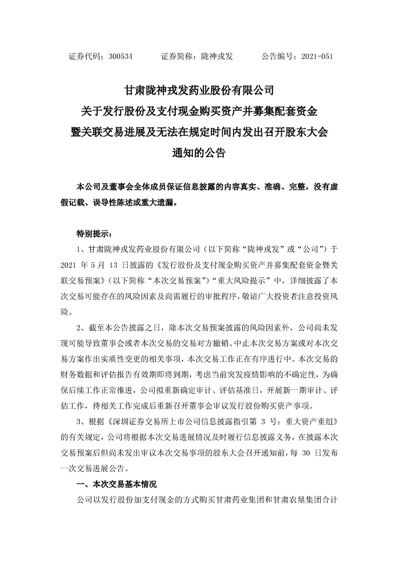 關(guān)于發(fā)行股份及支付現(xiàn)金購買資產(chǎn)并募集配套資金暨關(guān)聯(lián)交易進(jìn)展及無法在規(guī)定時(shí)間內(nèi)發(fā)出召開股東大會通知的公告