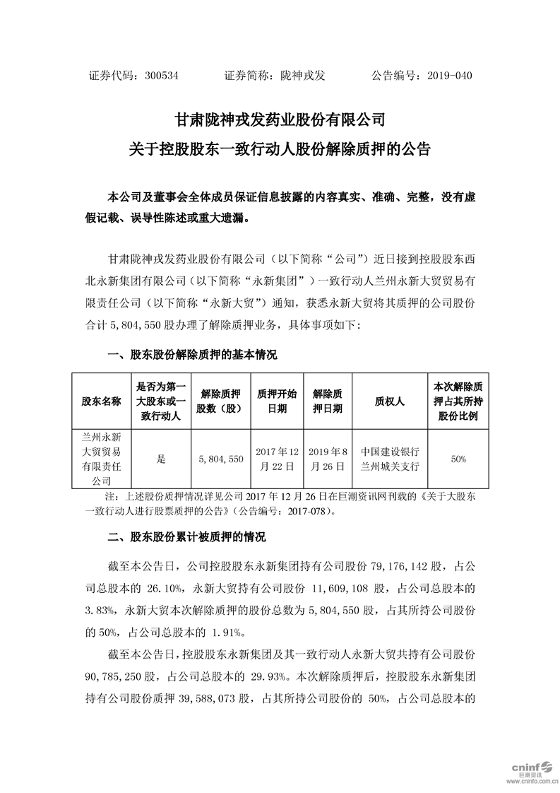 關于控股股東一致行動人股份解除質押的公告
