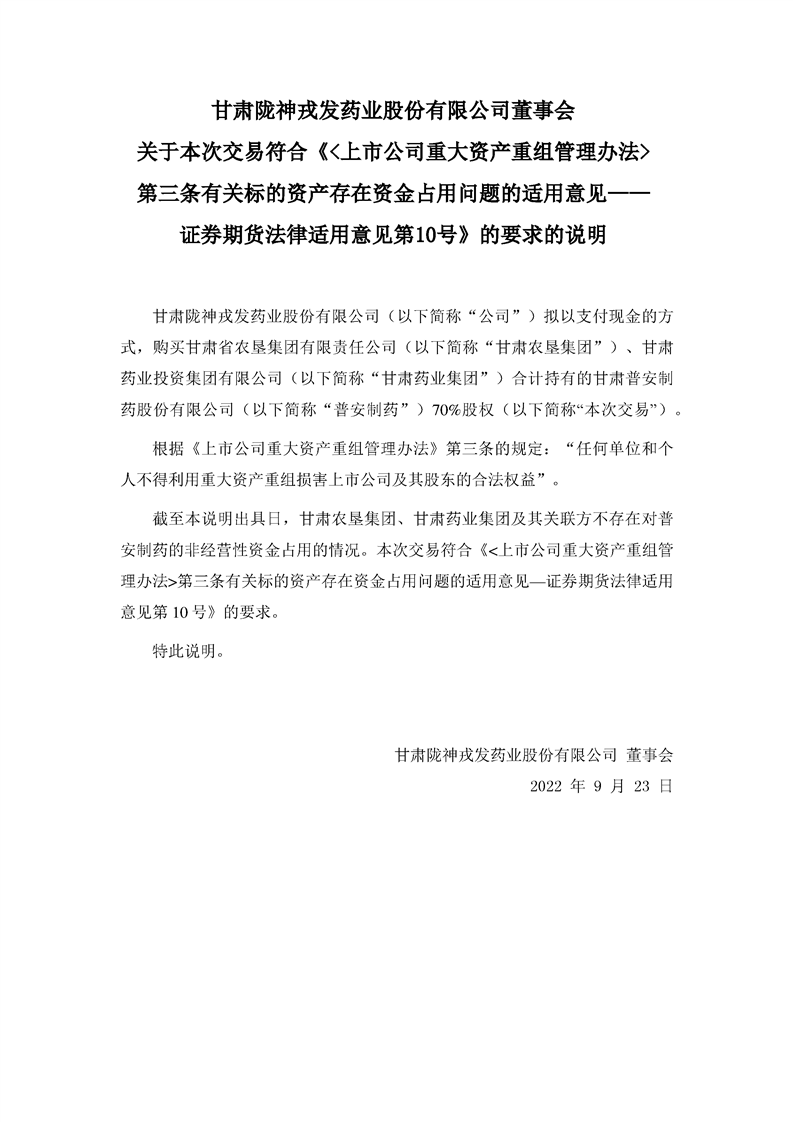隴神戎發(fā):關(guān)于本次交易符合《上市公司重大資產(chǎn)重組管理辦法第三條有關(guān)標(biāo)的資產(chǎn)存在資金占用問(wèn)題的適用意見——證券期貨法律適用意見第10號(hào)》的要求的說(shuō)明
