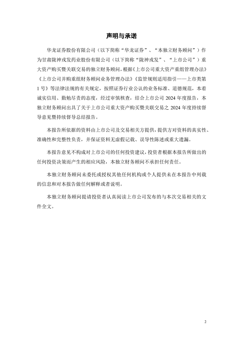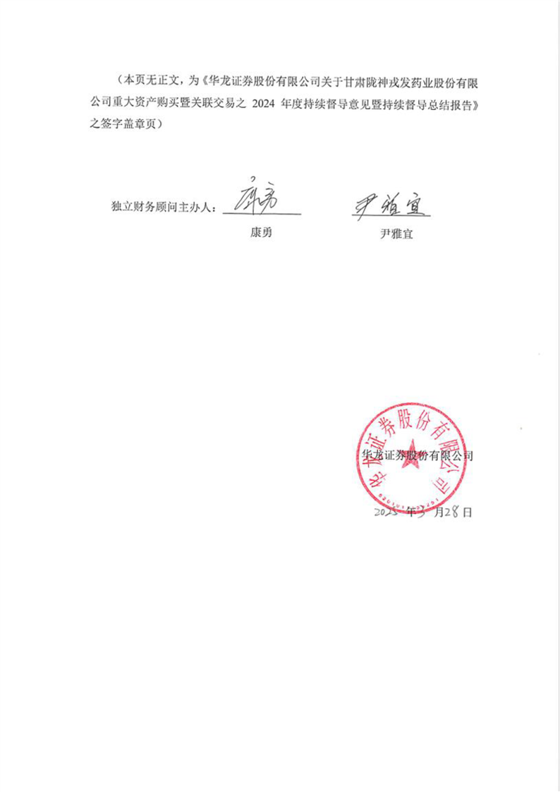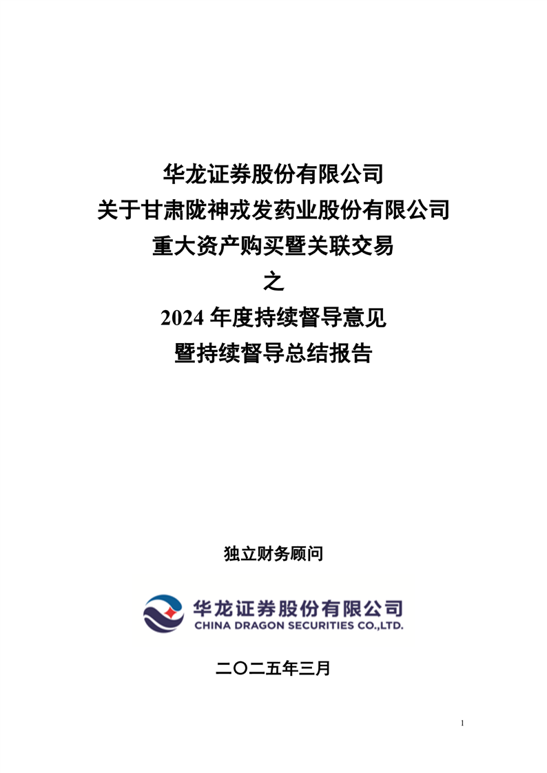 華龍證券股份有限公司關于甘肅隴神戎發(fā)藥業(yè)股份有限公司重大資產(chǎn)購買暨關聯(lián)交易之2024年度持續(xù)督導意見暨持續(xù)督導總結(jié)報告