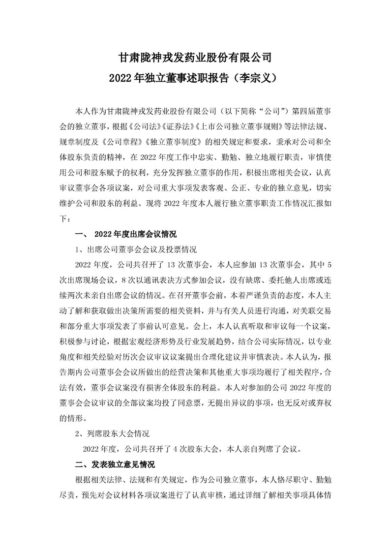 2022年獨(dú)立董事述職報(bào)告(李宗義)