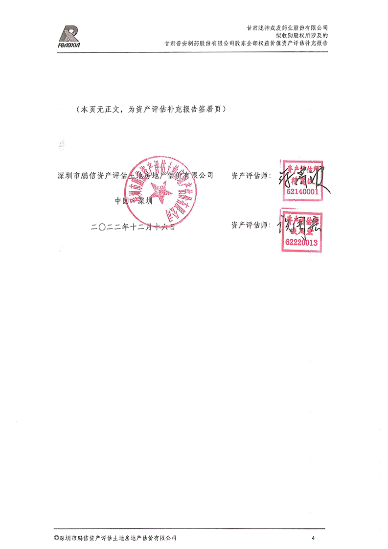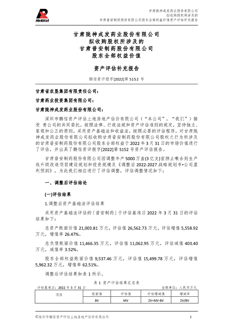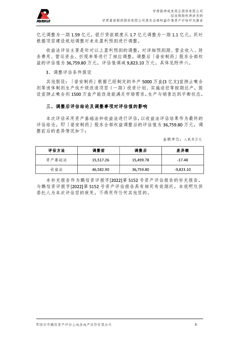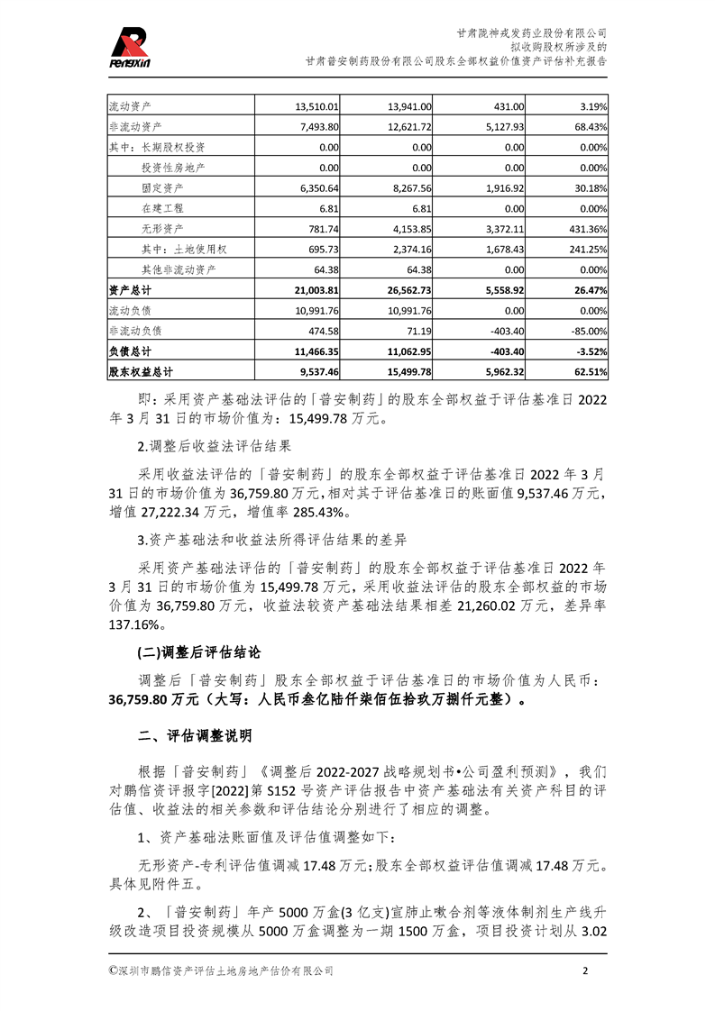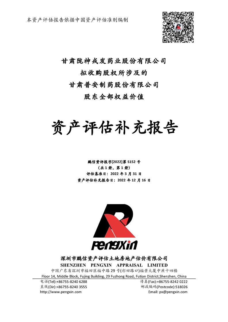 甘肅普安制藥股份有限公司全部權(quán)益價值資產(chǎn)評估補充報告-鵬信資評報字[2022]第S152號