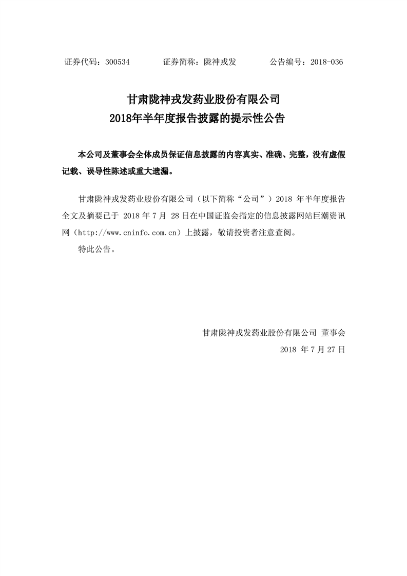 2018年半年度報告披露的提示性公告