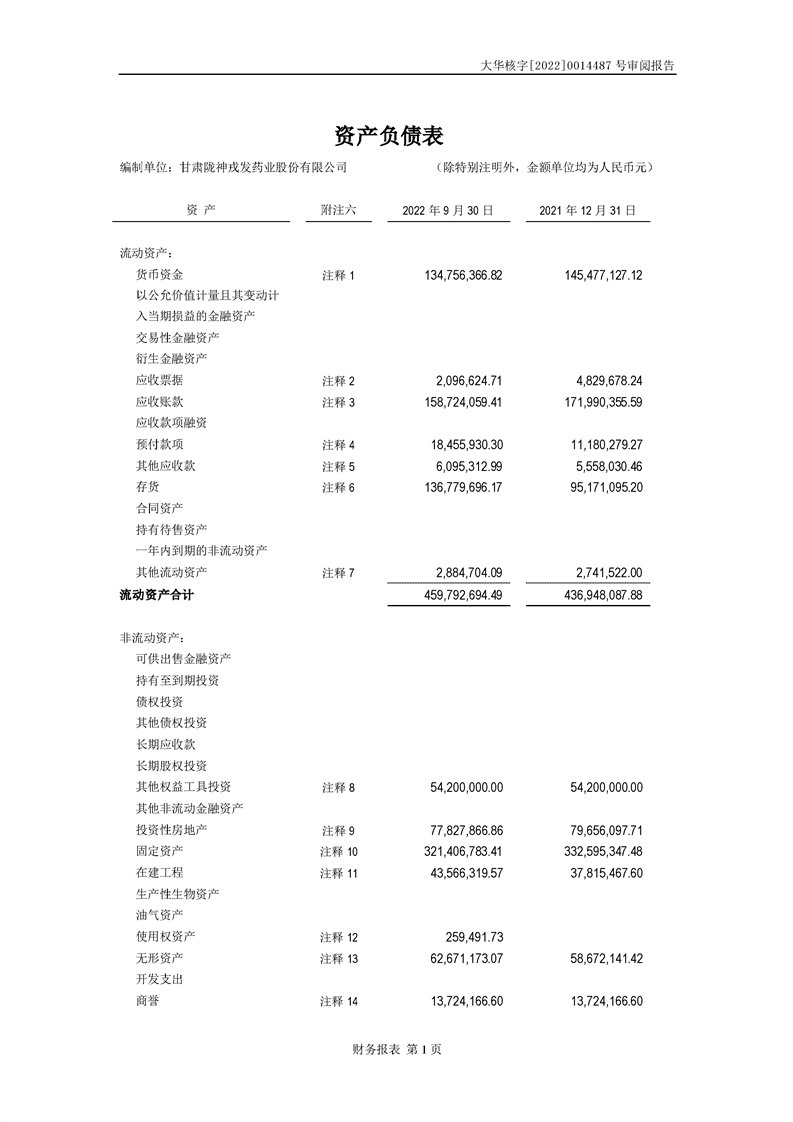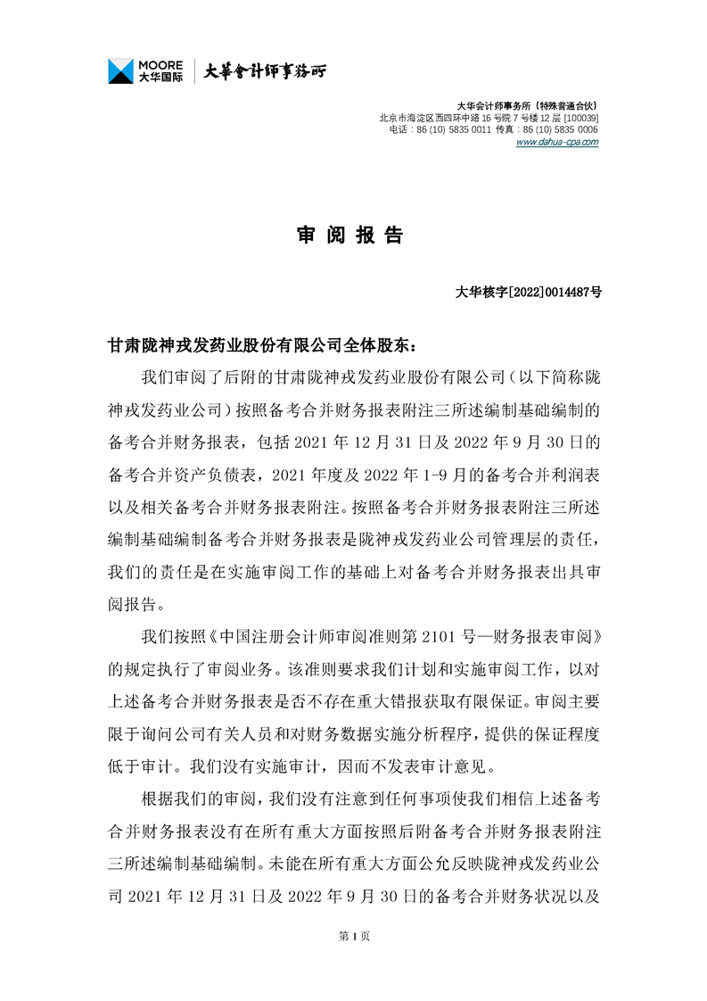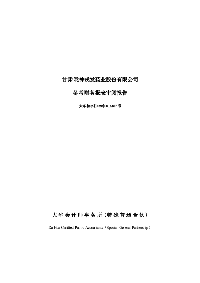 甘肅隴神戎發(fā)藥業(yè)股份有限公司備考財(cái)務(wù)報(bào)表審閱報(bào)告-大華核字[2022]0014487號(hào)