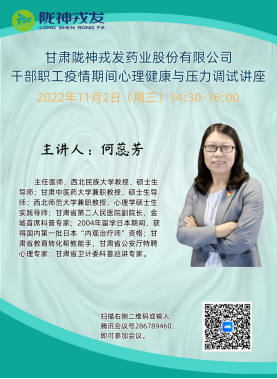 為有效緩解新冠肺炎疫情導(dǎo)致的負(fù)面影響,幫助公司干部職工積極預(yù)防和減輕疫情所造成的心理障礙及負(fù)面情緒,保障公司干部職工身心健康,11月2日下午,公司特邀甘肅省第二人民醫(yī)院副院長(zhǎng),西北民族大學(xué)教授、碩士生導(dǎo)師何蕊芳教授為公司干部職工開(kāi)展“疫情期間心理健康與壓力調(diào)試”線上講座,公司近百名職工在線學(xué)習(xí)。