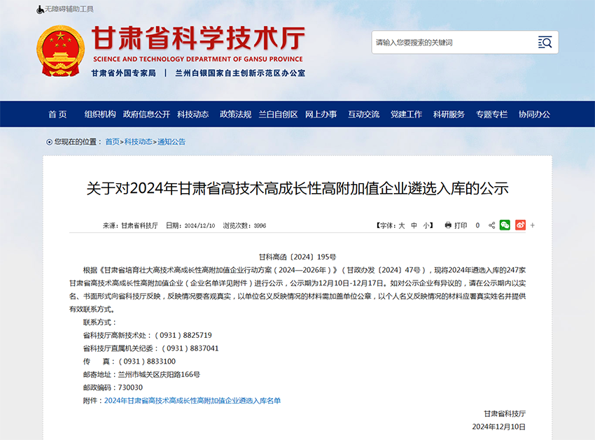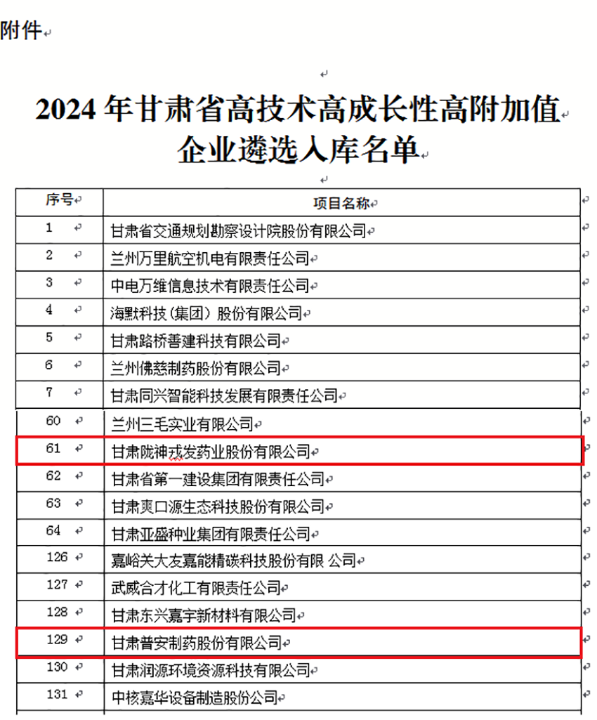 12月10日,甘肅省科學技術廳發(fā)布了《關于對2024年甘肅省高技術高成長性高附加值企業(yè)遴選入庫的公示》(甘科高函〔2024〕195號)。根據(jù)《甘肅省培育壯大高技術高成長性高附加值企業(yè)行動方案(2024—2026年)》(甘政辦發(fā)〔2024〕47號),經(jīng)過前期遴選,我公司甘肅隴神戎發(fā)藥業(yè)股份有限公司及控股企業(yè)甘肅普安制藥股份有限公司榜上有名,入選甘肅省高技術高成長性高附加值企業(yè)名單并進行公示。