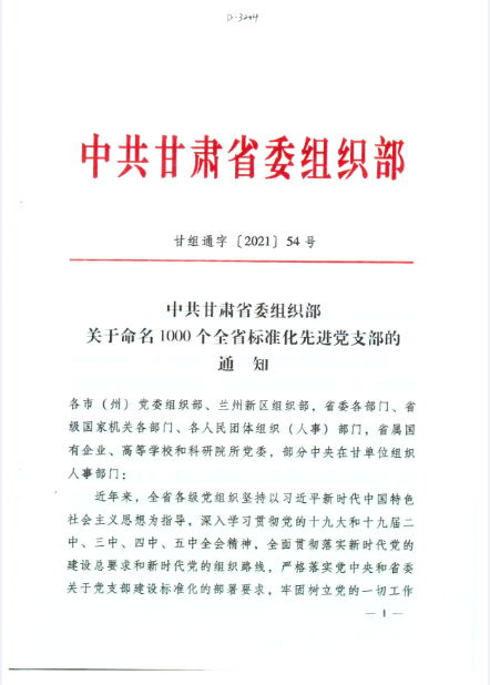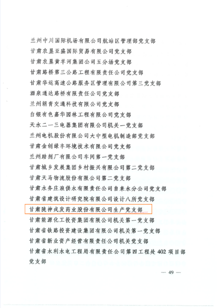 近日,甘肅省委組織部印發(fā)《關(guān)于命名1000個全省標(biāo)準(zhǔn)化先進(jìn)黨支部的通知》,對在決戰(zhàn)決勝脫貧攻堅、統(tǒng)籌推進(jìn)疫情防控和經(jīng)濟(jì)社會發(fā)展、推動脫貧攻堅與鄉(xiāng)村振興有效銜接等重大任務(wù)、中心工作中涌現(xiàn)出的1000個標(biāo)準(zhǔn)化先進(jìn)黨支部進(jìn)行了命名。甘肅隴神戎發(fā)藥業(yè)股份有限公司所屬生產(chǎn)黨支部光榮上榜。