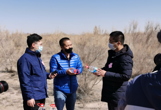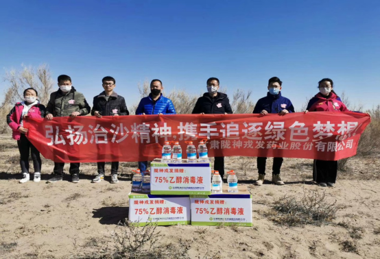 2020年3月16日,甘肅隴神戎發(fā)藥業(yè)股份有限公司志愿者一行4人與甘肅衛(wèi)視《好人在身邊》欄目組驅(qū)車400多公里,來到位于甘肅省武威市民勤縣的騰格里沙漠最西端,在一望無際的沙漠戈壁中學習打草格、種梭梭樹,感受了治沙志愿者為民勤的治沙事業(yè)所付出的艱辛勞動。公司副總經(jīng)理錢雙喜代表隴神戎發(fā)為“青梭公益”的志愿者捐贈公司生產(chǎn)的75%的乙醇消毒液,用于治沙志愿者在治沙過程中人員和器皿的消毒。
