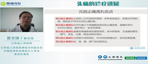第三場(chǎng)交流會(huì)由中國醫(yī)師協(xié)會(huì)神經(jīng)介入專業(yè)委員會(huì)委員、江西省人民醫(yī)院神經(jīng)內(nèi)科副主任曹文鋒教授主講《原發(fā)性頭疼的診療進(jìn)展》,曹主任總結(jié)頭痛是最常見的臨床癥狀之一,慢性頭痛嚴(yán)重影響到人們生活質(zhì)量,頭痛患者經(jīng)常伴有抑郁癥、焦慮癥以及睡眠障礙等,臨床常用到的藥物副作用大,長期使用會(huì)導(dǎo)致藥物過度使用性頭痛,而元胡止痛滴丸含有多種有效成分,能夠多靶點(diǎn)聯(lián)合作用,可以調(diào)節(jié)疼痛機(jī)制的各種神經(jīng)遞質(zhì),兼顧治療心理障礙,且副作用小。