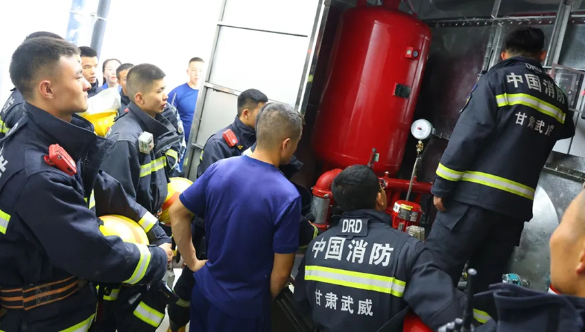 15時40分,火勢因泄漏量增大突然升級——10號罐底部出液閥燃起火焰,熱輻射導致相鄰罐溫度快速攀升?!皢右患墤?yīng)急響應(yīng)!”現(xiàn)場總指揮下達指令:“疏散組立即引導罐區(qū)周邊50米內(nèi)人員撤離至安全區(qū)域;滅火組利用泡沫式滅火器壓制外圍火勢;通訊組聯(lián)系涼州區(qū)消防中隊請求支援!”