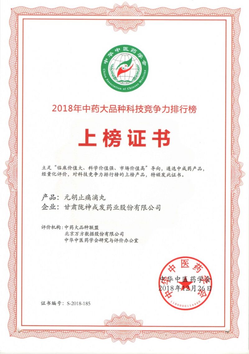 2018年12月26日,“第四屆中藥大品種聯(lián)盟論壇暨中藥大品種科技競爭力排行榜發(fā)布會”在北京召開。隴神戎發(fā)獨(dú)家產(chǎn)品元胡止痛滴丸成功上榜,并在 《甘肅省中藥大品種科技競爭力排行榜》(省區(qū)榜單)和《神經(jīng)系統(tǒng)用藥中藥大品種科技競爭力榜》(治療領(lǐng)域榜單)兩大榜單中分別位列第三名和第九名。
