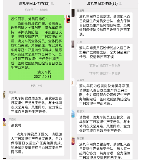 公司加快推進黨建融入重大項目建設、融入生產、科技、營銷攻堅行動,在重點項目和重大工作任務現場開展“亮身份、樹形象、做表率”活動,黨員身份公開化、監(jiān)督制度化、作用最大化,黨員主動亮身份,一名黨員一面旗,進一步提升黨員身份意識、責任意識和先鋒模范意識,不斷增強黨支部的號召力、凝聚力和戰(zhàn)斗力。2021年10月,隴神戎發(fā)成立了 “黨旗為引領、圓夢隴藥”沖刺行動黨員突擊隊。在25名黨員干部帶領下,全體干部職工齊心協力,確保疫情防控和生產保障“兩手抓”、“兩不誤”。