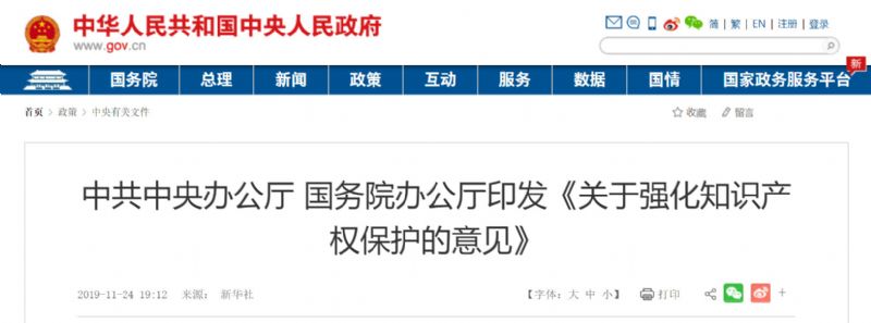 新華社北京11月24日電 近日,中共中央辦公廳、國(guó)務(wù)院辦公廳印發(fā)了《關(guān)于強(qiáng)化知識(shí)產(chǎn)權(quán)保護(hù)的意見》,并發(fā)出通知,要求各地區(qū)各部門結(jié)合實(shí)際認(rèn)真貫徹落實(shí)。