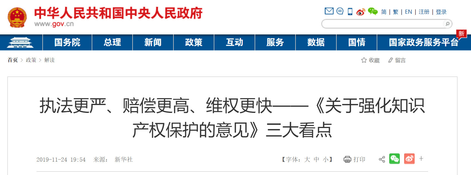 新華社北京11月24日電 題:執(zhí)法更嚴(yán)、賠償更高、維權(quán)更快——《關(guān)于強(qiáng)化知識(shí)產(chǎn)權(quán)保護(hù)的意見》三大看點(diǎn)