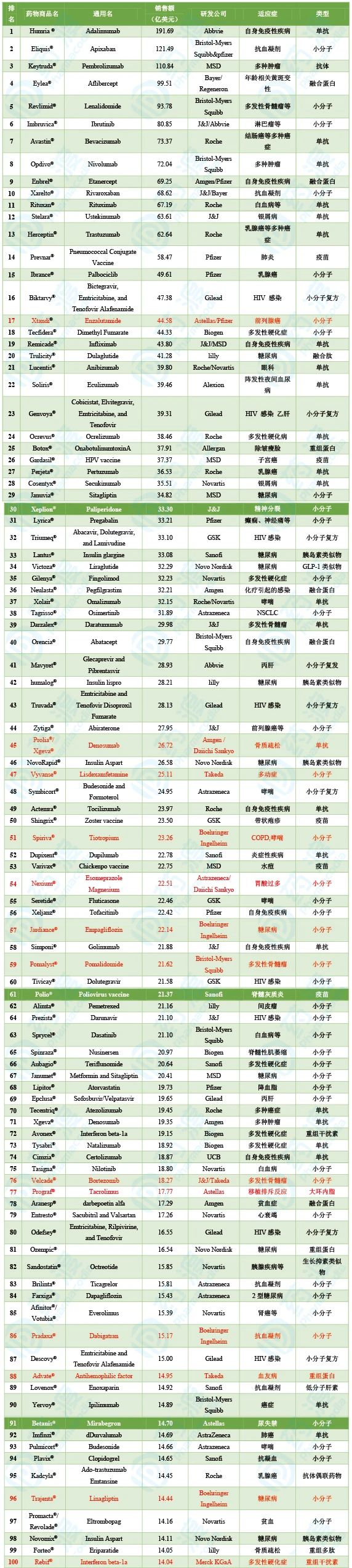 2019年全球藥物銷售額Top100