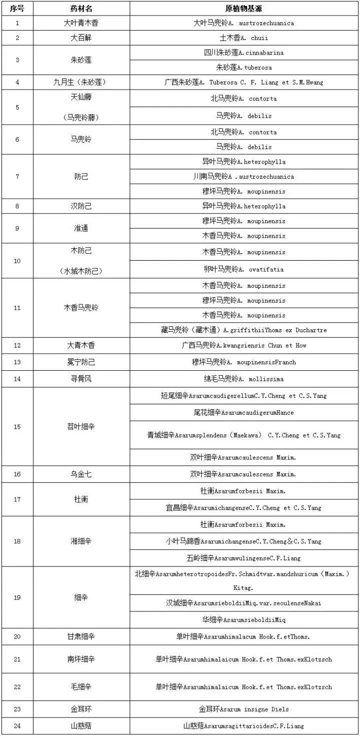 1.關(guān)木通、青木香、廣防己的藥材標(biāo)準(zhǔn)已撤銷(xiāo),故未列入。