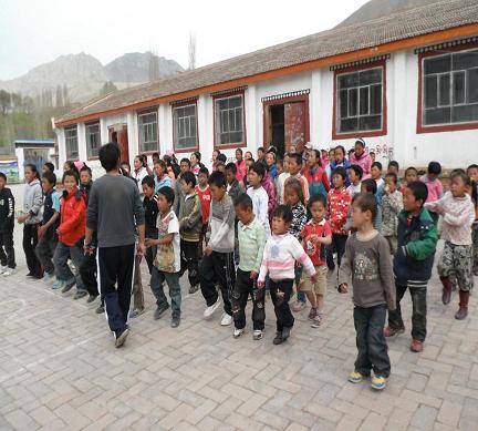 從長途汽車上下來,映入眼簾的是重重高山和水泥場的隆隆聲響。穿著僧袍的校長化旦尖措也來到了我們面前,他把我們帶來的物品放在他的車上,為我們指了路后就又去鎮(zhèn)上辦事去了,我們便向著大山更深處走去。沒有了車聲與水泥廠的噪音,安靜的村落里杏花正開,洶涌的夏河水驕傲的流淌,淳樸的藏族婦女們滿面慈祥。在一位好心爺爺?shù)膸ьI(lǐng)下我們到達(dá)了化旦尖措孤兒學(xué)校,校門里的老師在迎接我們,我們終于到了!