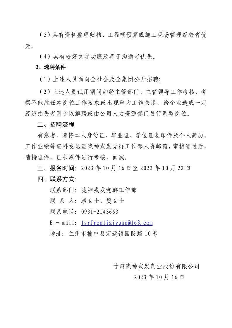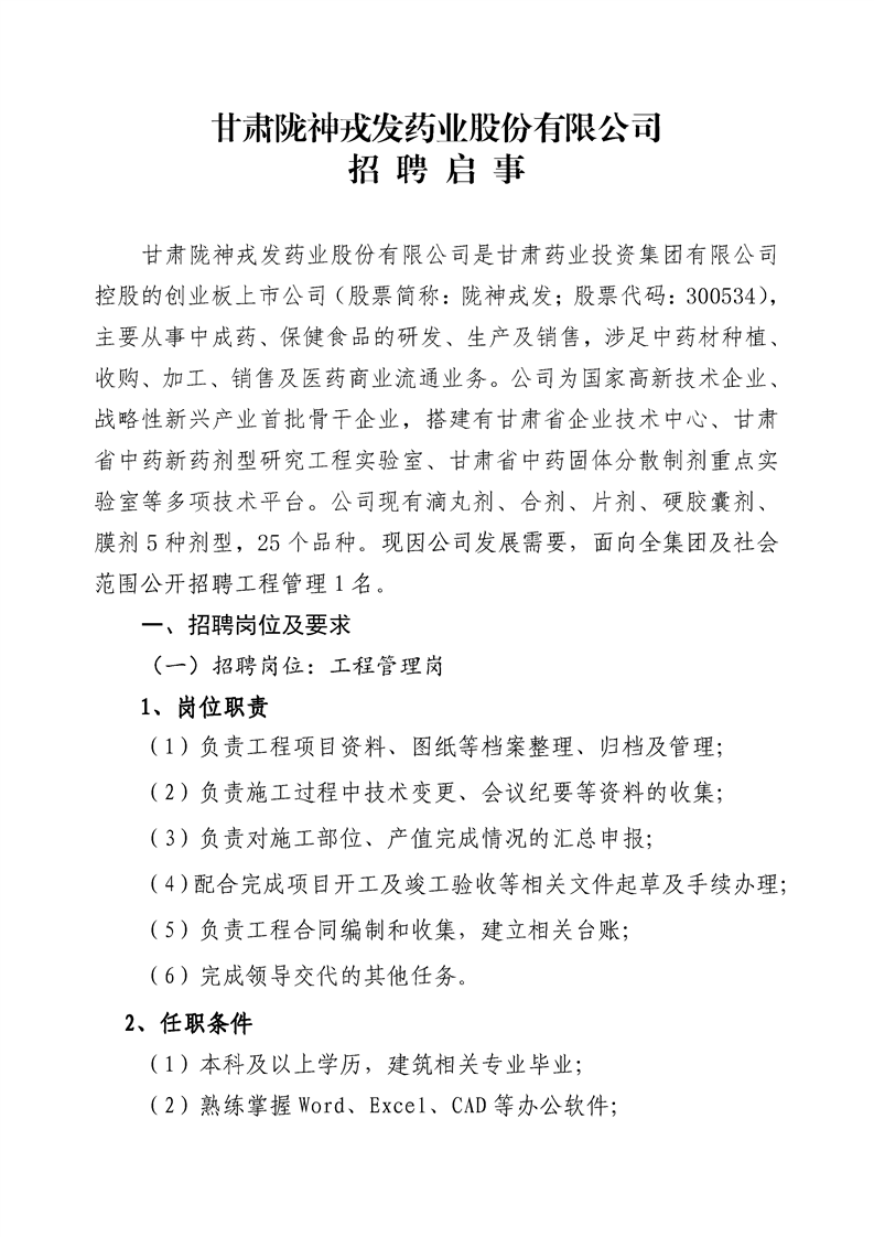 甘肅隴神戎發(fā)藥業(yè)股份有限公司招聘啟事